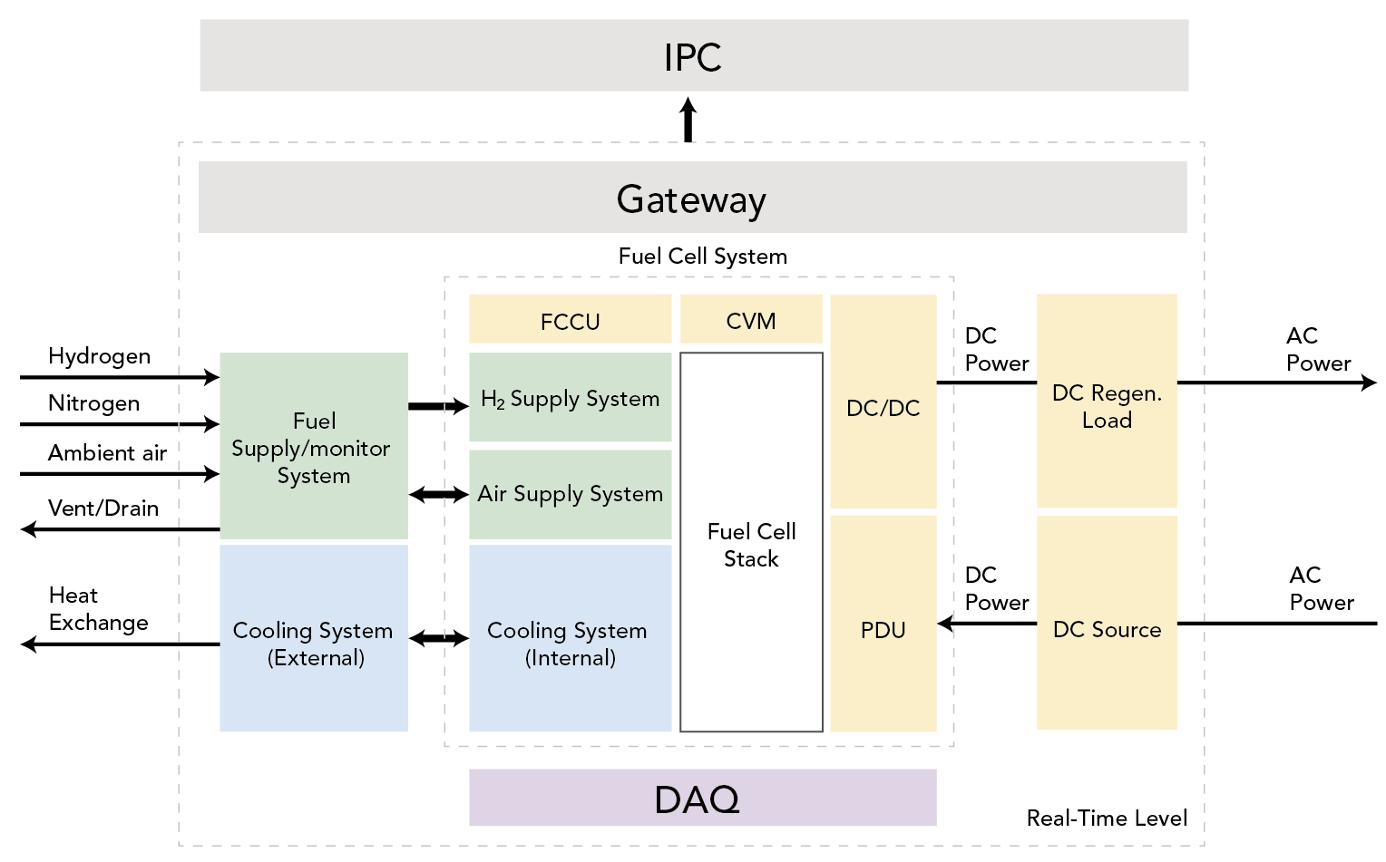 質子交換膜燃料電池發動機(PEM Fuel Cell System, PEMFCsys)是將燃料電池堆(Fuel Cell Stack, FC Stack)為主要以電化學反應進行發電,結合系統周邊元件(Balance of Plant, BOP)提供給燃料電池堆的外部氫氣壓力調節、空氣輸送供給、燃料電池堆散熱、輸出與供給電力控制…等模塊化整合,并組裝成為一套氣轉電(Gas to Power)的獨立發電單元。然而,燃料電池堆的輸出功率能決定燃料電池發動機的總輸出功率,間接影響系統周邊元件硬體規格范疇與元件成本,整體系統從開發到生產的階段,系統測試范疇會依照各周邊元件的開發進度下有所不同,因此系統測臺配置彈性的需求設計亦為重要的考量因素。