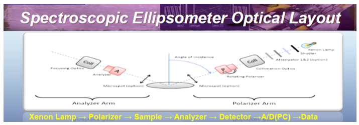 測量原理:光源經(jīng)過起偏器和濾鏡后得到已知入射光的偏振態(tài),偏振光在樣品表面被反射,測量得到反射光偏振態(tài)(幅度和相位),可計算出材料的光學(xué)屬性,包括膜厚、透過率、消光系數(shù)等。