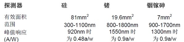 常見的光電二極管通常采用硅(Si)、鍺(Ge)或銦砷化鎵等材料制作而成。光電二極管具有體積較小、靈敏度高、功率測量范圍大的顯著特點。每一種光電二極管具有不同的響應(yīng)范圍和峰值波長,在不同的波長處具有不同的響應(yīng)度。響應(yīng)度是傳感器把入射光轉(zhuǎn)換為感應(yīng)電流的效率的效果體現(xiàn),單位是A/W。例如美國藍菲光學公司(Labsphere)的一款激光功率計(LFPMS)采用了硅型二極管探測器。 它的波長響應(yīng)范圍在300-1100nm處,其中峰值響應(yīng)在920nm時到達0.48A/W。下圖2是LFMPS光電二極管探測器的性能參數(shù)。