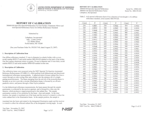 圖1、NIST出具的Labsphere積分球涂層反射率校準報告