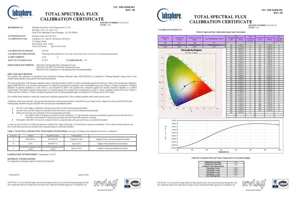 系統自帶標準燈和標準燈電源,可便于客戶現場校準,校準數據經過NVLAP認可,并可溯源至美國國家標準和技術協會(NIST),提供的校準數據是整個可見光波段絕對光譜輻射通量而不是幾個特定波長的流明值,保證了校準的準確性,目前大部分設備廠家還達不到這一點。另外,標準燈不用返回原廠校準,節省費用,節省時間,而且保證使用者的標定工作不受影響。