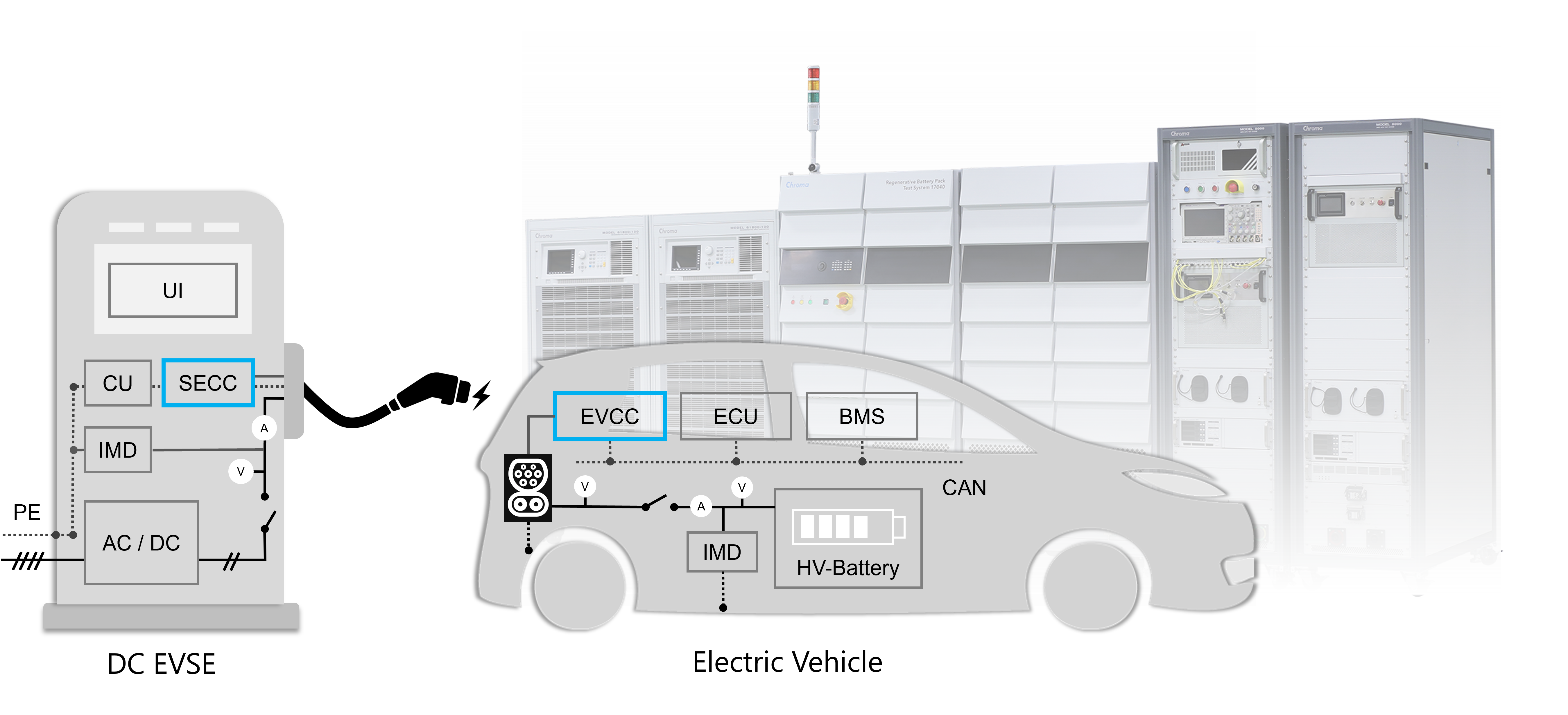 當(dāng)充電槍插上電動(dòng)車(chē)的充電座之后,雙邊的接觸偵測(cè)與通訊協(xié)議就開(kāi)始運(yùn)作。當(dāng)在充電預(yù)備、開(kāi)始和結(jié)束的各狀態(tài)中,若充電設(shè)備通訊控制器(SECC)和電動(dòng)車(chē)通訊控制器(EVCC)交握有任何異常(包含超時(shí)、資料格式辨識(shí)、異常處理、時(shí)序等),充電運(yùn)行就將會(huì)被迫中斷。所以自動(dòng)化測(cè)試系統(tǒng)(ATS)必須具備模擬電動(dòng)車(chē)通訊的功能,甚至可以故意設(shè)定異常動(dòng)作,以驗(yàn)證充電樁的中斷保護(hù)功能。另外ATS還需模擬電動(dòng)車(chē)的充電座,規(guī)格必須能符合電氣測(cè)試之要求,且具備電子鎖、溫度監(jiān)控、大功率斷路器以及散熱功能,可確保測(cè)試過(guò)程的安全性。測(cè)試系統(tǒng)建議采用模組化且可更換的EV模擬器與充電座,可快速更換避免產(chǎn)線(xiàn)因異常問(wèn)題造成長(zhǎng)時(shí)間測(cè)試中斷。另外好處是可彈性調(diào)整測(cè)試不同標(biāo)準(zhǔn)的產(chǎn)品,或未來(lái)需求而升級(jí)。